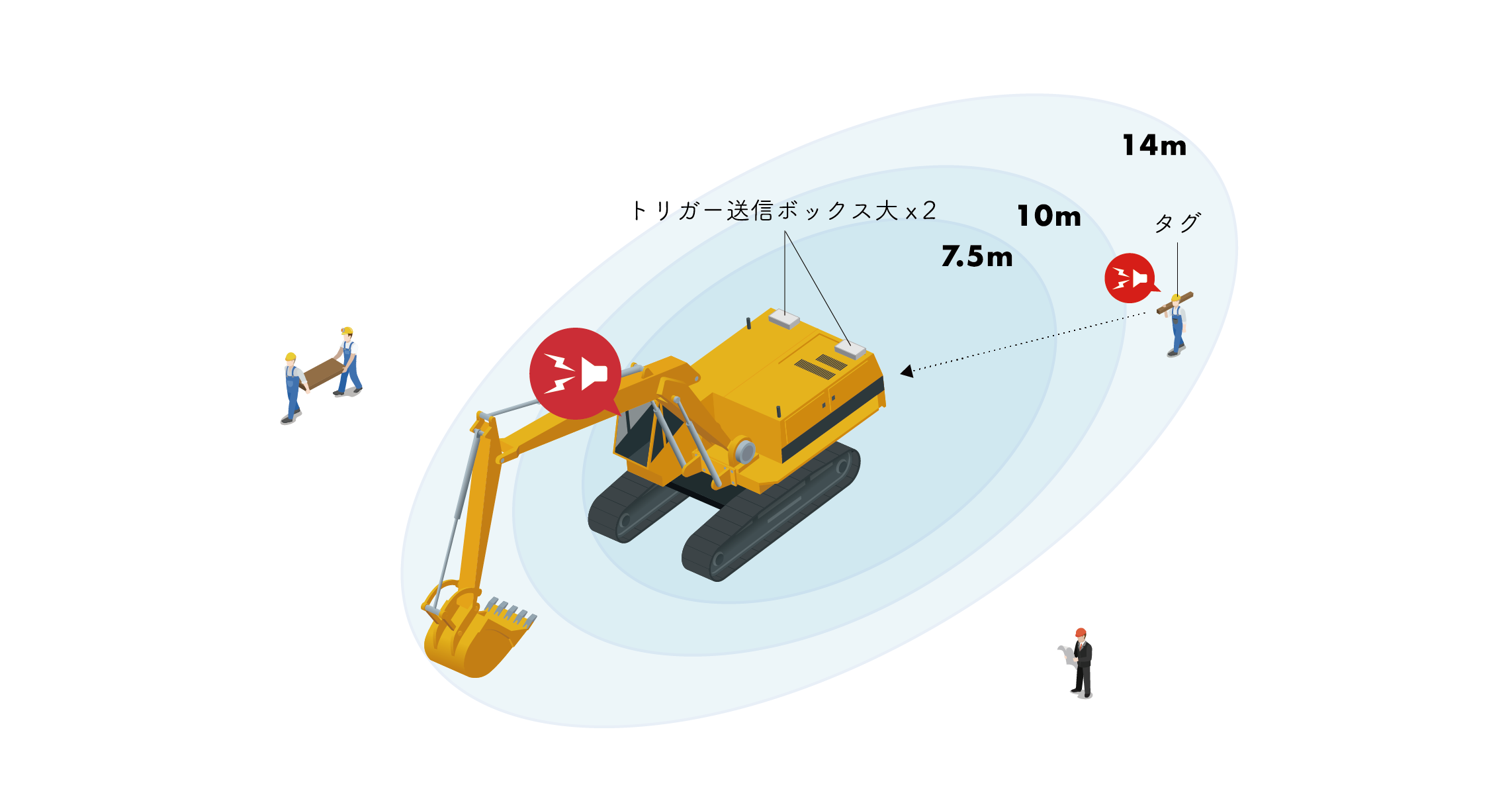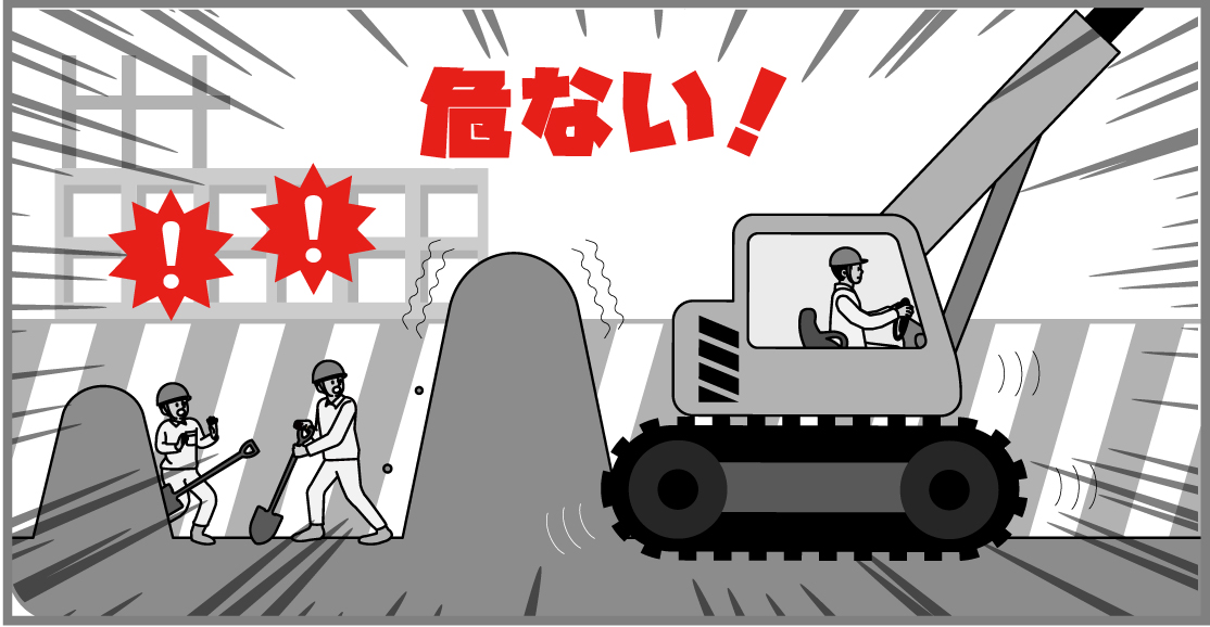 重機を使う人、周りで作業する人、それぞれが常にお互いを気遣いながら作業すれば、衝突は防ぐことができます。しかし、積み荷や死角など「見えない状況」をなくすことは不可能です。