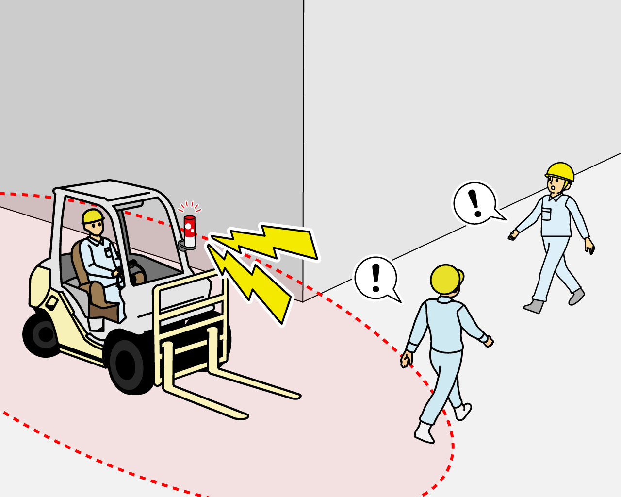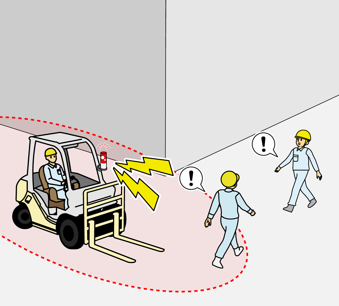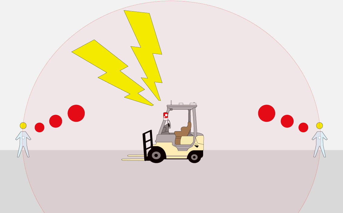 オペレーターが目で見える範囲の作業者はもちろん、目視できない前後左右、死角、曲がり角、物陰の作業者を検知します。